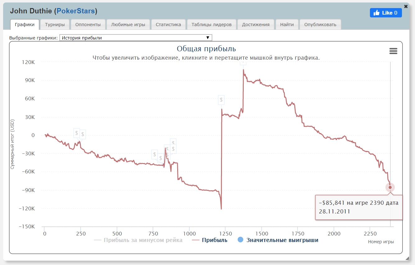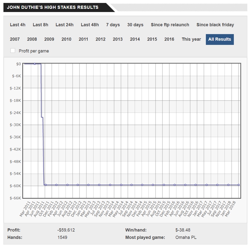 — с 2006-го по 2011-ый годы John Duthie отыграл 2’390 турниров на ABI $615. В списке его онлайн-регалий были победы SCOOP и WCOOP, но за всё время его аккаунт оказался в минусе на $85k: