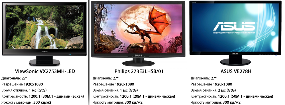 Как вы видите, время отклика греет душу любителю компьютерных игрушек. Стоит учесть, что заявленные данные являются, в первую очередь, “маркетинговыми”. В реальных полевых условиях вы очень редко получите в динамических картинках 1мс. И не нужно забывать, что эта матрица действительно способна выдавать такое время отклика. С контрастностью у всех трех моделей все хорошо – за счет личной технологии впереди ASUS VE278H, но и цифры на Philips 273E3LHSB/01 и ViewSonic VX2753MH-LED более, чем комфортные.
