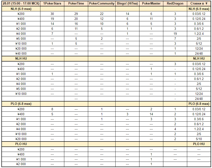 - ¥1.000 (NL150): по 10-16 столов на 1PokerStars, PokerTime и PokerCommunity. По 5-6 столов на Bingo! (HiTea) и PokerMaster. И 3 стола на ¥1200 (NL170) на RedDragon.