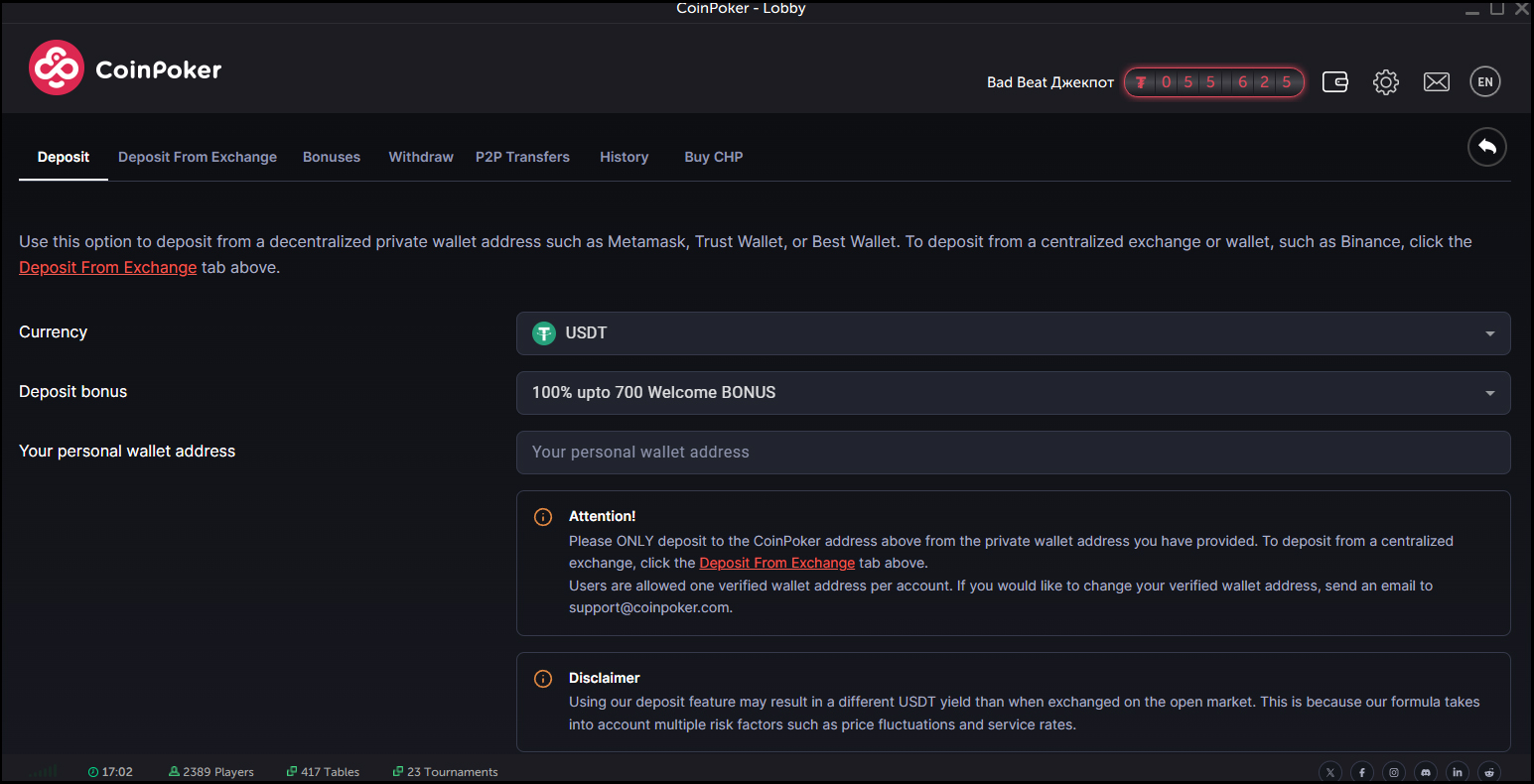 - В руме CoinPoker основная валюта бай-инов — USDT