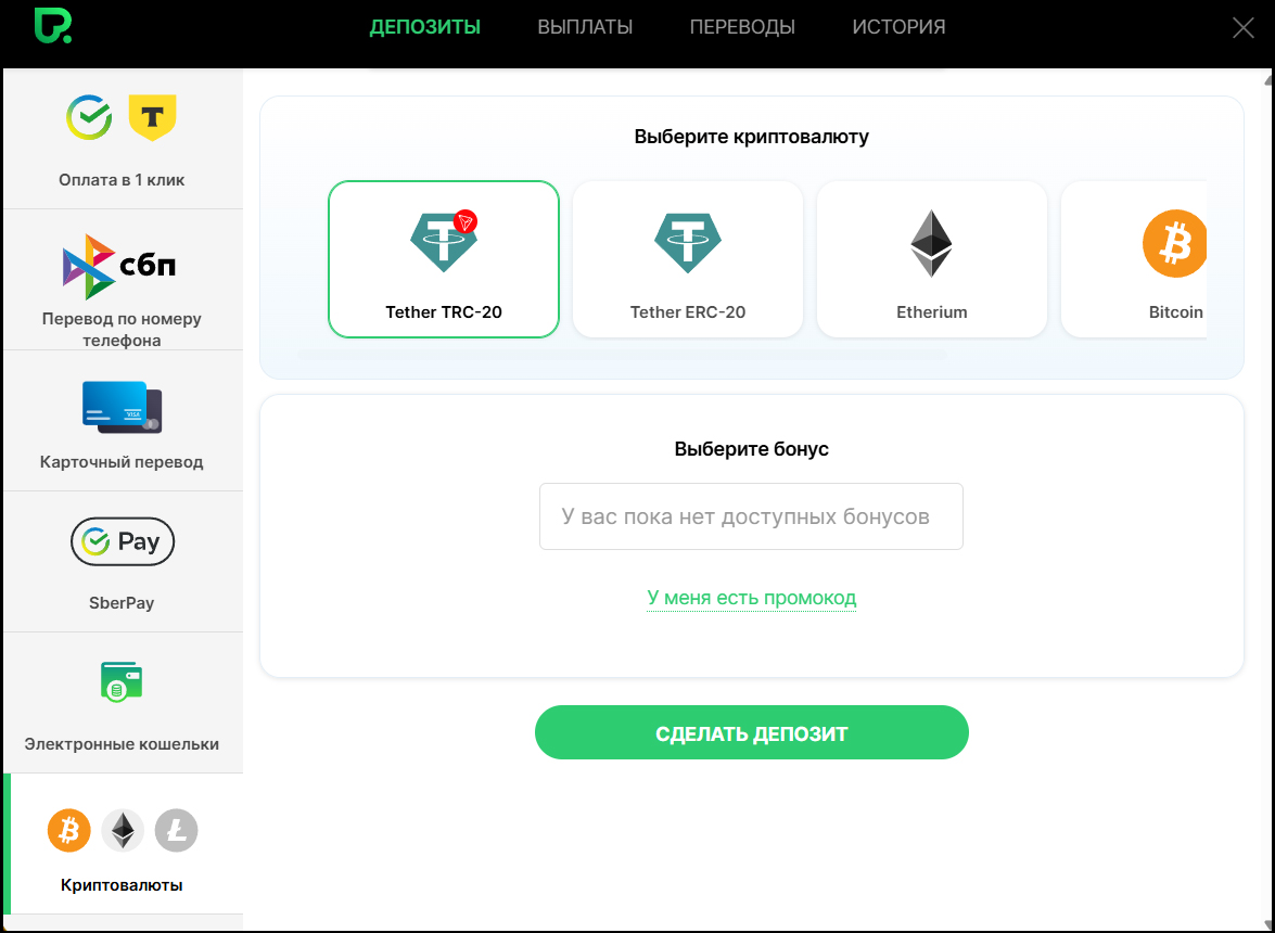 - Доступные криптовалюты: BTC, ETH, LTC, USDT (TRC-20 и ERC-20)