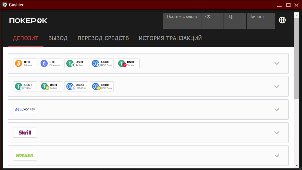 Например, при игре от Покерофф вы можете использовать USDT (TRC-20 и ERC-20), а также агентскую кассу для переводов без комиссий удобными методами, в том числе между своими счетами в разных клубах и румах.