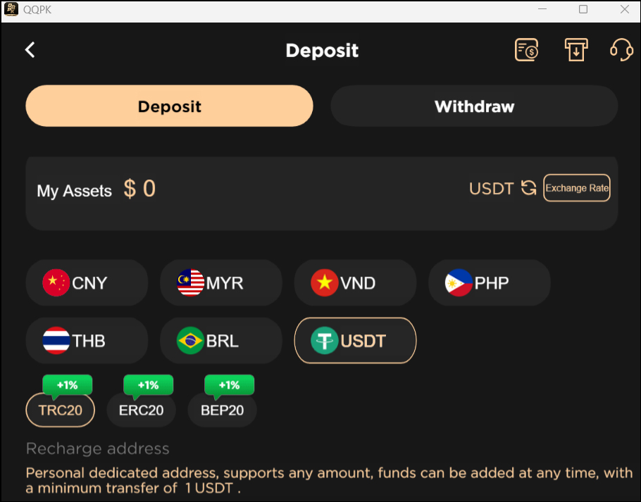 - В приложении QQPK доступны депозит и кешаут в криптовалюте без комиссий