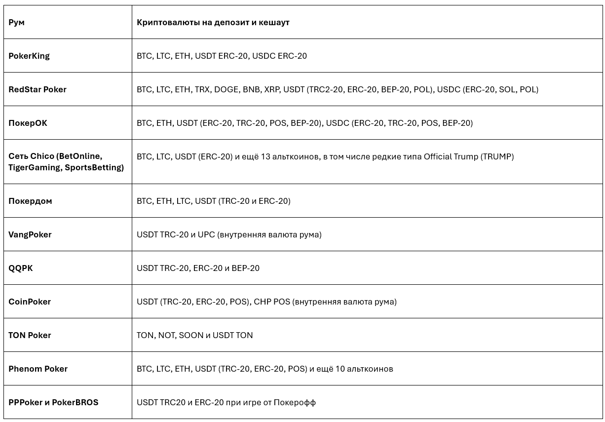 Криптовалютная и покерная индустрии сплетаются всё сильнее. К 2025 году большинство популярных покерных румов предлагают игрокам использование крипты — в основном, для транзакций, но в некоторых случаях и как основную валюту в клиенте.