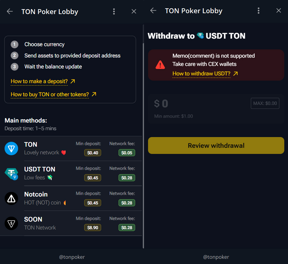 - На TON Poker есть депозит и кешаут в криптовалюте без комиссий