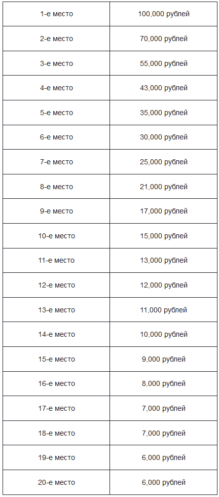 3. Призовой фонд делится на 20 игроков, согласно таблице выплат призовых.