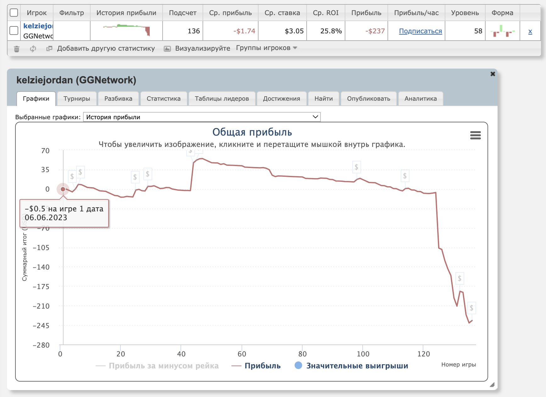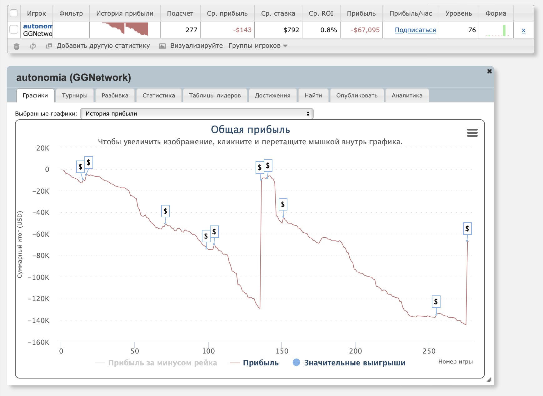 Это не самый крупный занос в карьере autonomia. В мае прошлого года он выиграл $121,5K. Правда, с того момента он попал в даунстрик и проиграл $138K — вот график.