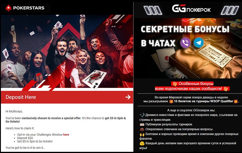 Индивидуальный подход и уникальные предложения для конкретного клиента всегда дают компаниям отличные результаты. Напиши о персональной скидке, как делает WIldberries, или пришли человеку код на подарок — и он с высокой вероятностью потратит деньги на твое предложение. Покерные компании также активно используют рассылки с персональными предложениями, особенно в этом преуспели PokerStars и GGПОКЕРОК. Тогда как Старзы специализируются на точечных акциях — дополнительные билеты для конкретного игрока за совершение депозита, персональные челленджи и бонусы, GGПОКЕРОК больше ориентирован на вознаграждение групп — например, пользователей соцсетей.