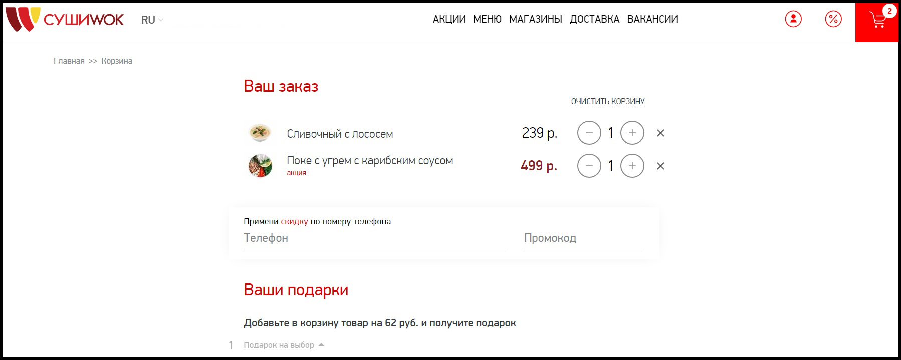 Например, у Sushi Wok есть акция — при наборе товаров на 800 рублей ты получаешь дополнительные пол литра лимонада или грустный ролл. При этом окажись в корзине еды на меньшую сумму, сайт всегда напоминает, что если ты добавишь еще чуть-чуть, то получишь подарок.