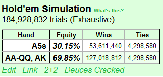 Для начала Борис выбирает те типы рук, с которыми он может делать 5-бет блеф. Он хотел бы делать это с руками, у которых есть приличное эквити на случай, если он получит колл от оппонента. Таким образом, с этой целью он может использовать Axs типы рук - A5s-A2s. Axs типы рук работают как блокеры против наличия у Алисы АА/АК типов рук (наличие туза у Бориса на руках уменьшает вероятность наличия у Алисы рук типа АА/АК) и у него всегда будет по крайней мере оверкарта, если у Алисы на руках будет другая карманная карта. Также у таких рук есть стрит и флеш потенциал. Более того, у Axs типов рук есть как минимум ~30% эквити, если 5-бет будет заколлирован, даже против сильного диапазона, как показано ниже: