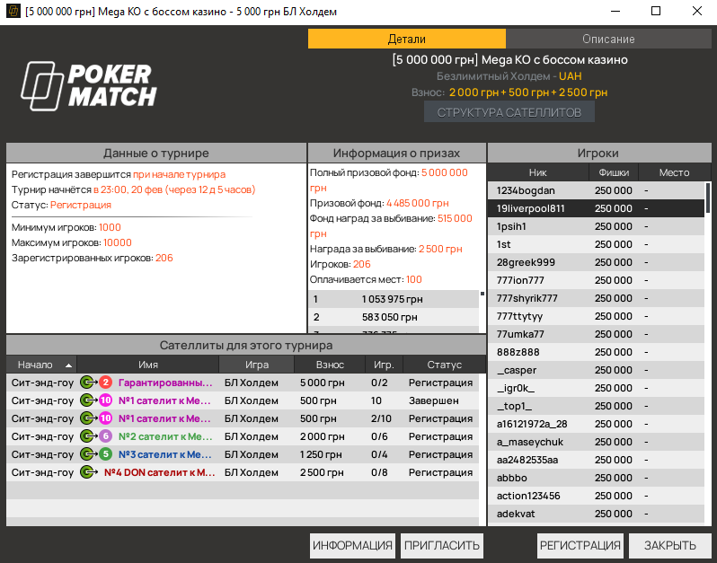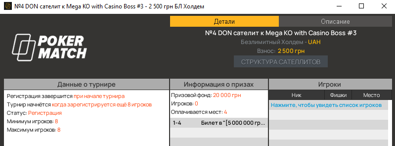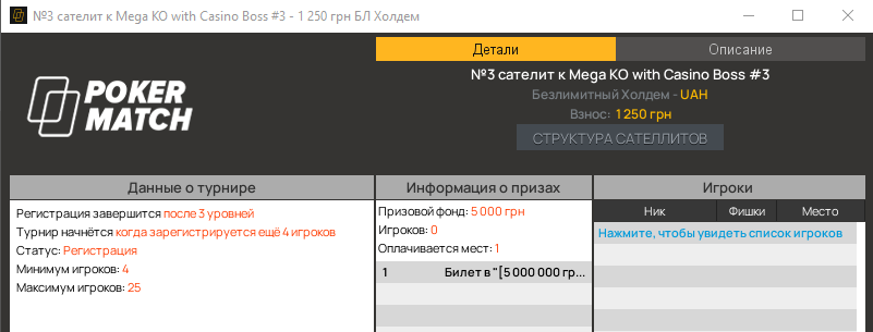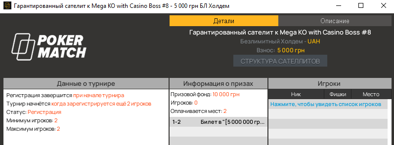 Опция регистрации в сам турнир отсутствует. Не очень понятно зачем это сделано, но это факт. Но игрокам оставили лазейку — беспроигрышный сателлит Heads Up Sit&Go за 5000 грн, где не надо играть. Просто регистрируетесь в этом сателлите и автоматически попадаете в целевой турнир.
