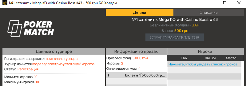 - №2 сателит к Mega KO with Casino Boss — 2000 грн, МТСНГ на 6-36 игроков — гарантия 2 билета на целевой турнир