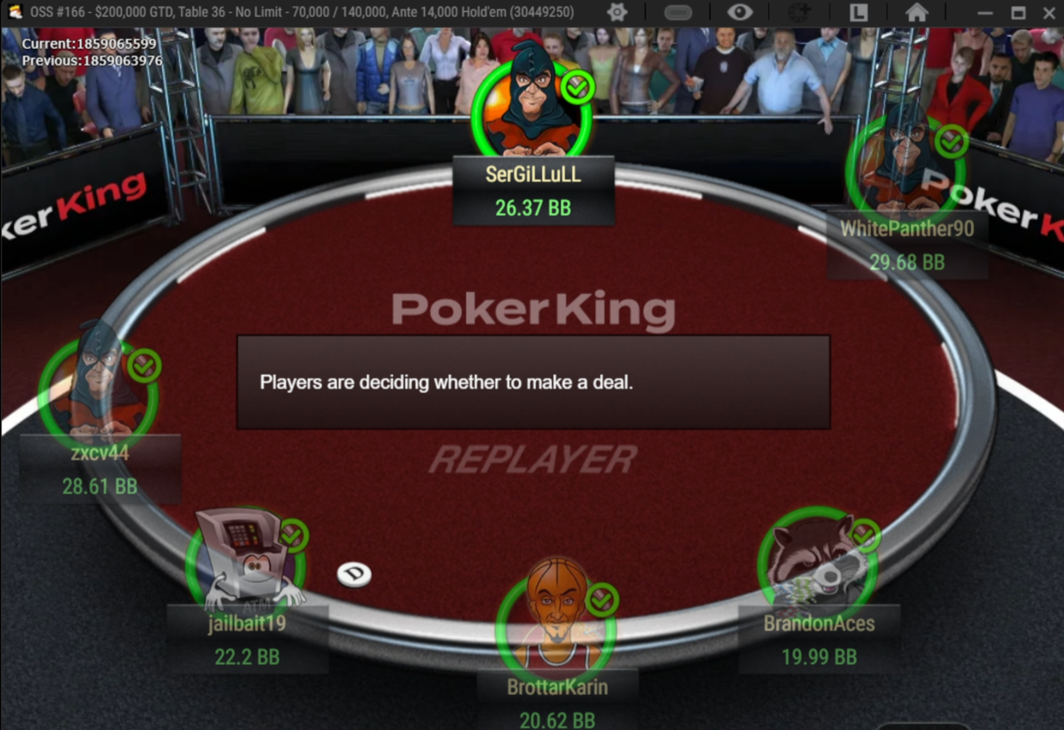 После часа финалки $630 OSS 166 $200K Gtd и вылета с неё двух игроков, оставшаяся шестёрка заключила сделку в практически равных стеках.