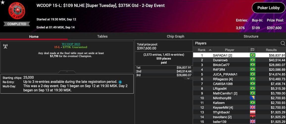 Всего на WCOOP прошло 60 турниров (включая сайд-ивенты), игроки из Бразилии одержали 12 побед.