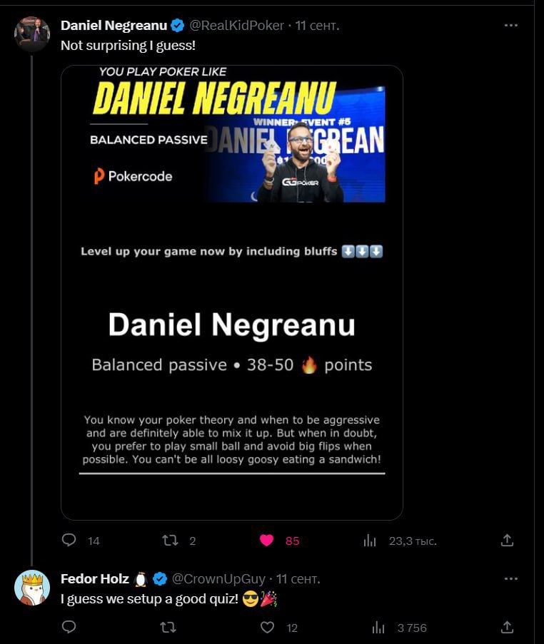 В конце квиз показывает, чей стиль игры вам ближе — Аллена Кесслера, Даниэля Негреану, Фила Хельмута, Тома Двана, Алана Китинга или самого Фёдора Хольца.