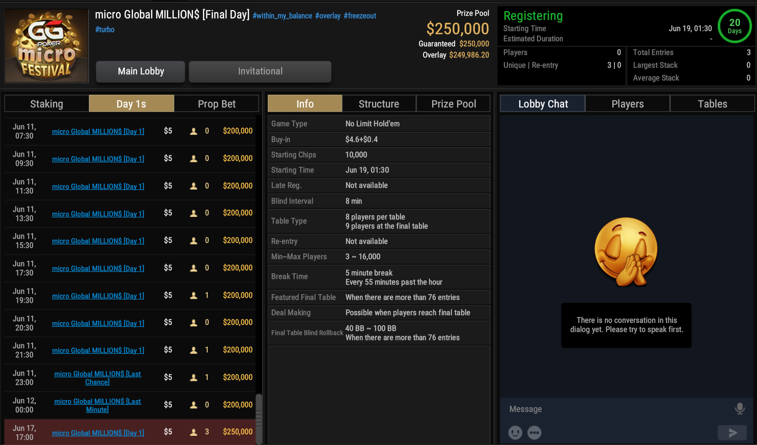 В расписании GGMF — 183 турнира с бай-инами от $1.88 до $25 и гарантиями от $1,000 до $1,000,000.