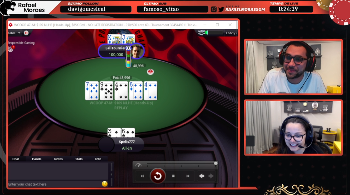 Несмотря на то, что Лали является состоявшейся стримершей (более 18 тыс фолловеров на Twitch), в этот день она решила обойтись без прямого эфира. Вместо неё работал на камеру муж — один из самых известных регов Бразилии Рафаэль «GM_VALTER» Мораэс (Rafael Moraes) с профитом более миллиона долларов на PokerStars. Он следил за успехами любимой в поздней стадии турнира и был вне себя от радости, когда она победила.