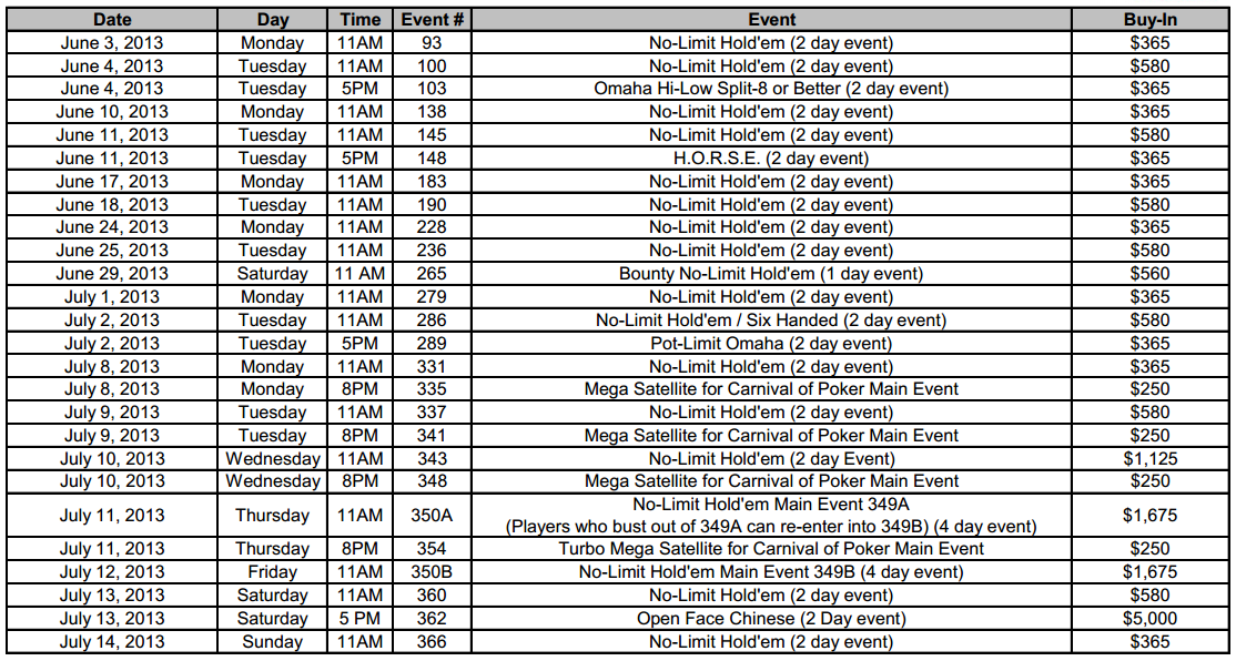 Совсем недавно мы писали о возродившейся серии оффлайн-турниров Carnivale of Poker, которая по замыслу организаторов Мировой Серии Покера станет более доступным вариантом главного события этого лета в мире покера. 21 турнир с бай-инами от $365 до $5,000 по популярным нынче дисциплинам – Холдем, Омаха, Микс-игры и Открытый Китайский Покер. Вместо золотых браслетов абсолютно новые золотые медальоны, которые, вероятно, не прославят обладателя, но могут стать великолепным началом для оффлайн карьеры. Помимо этого, 10 лучших игроков по итогам Карнавала разделят между собой еще и солидную сумму сверху - $100,000. Место действие – Rio, с 3 июня по 14 июля 2013 года.