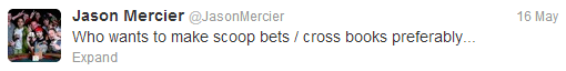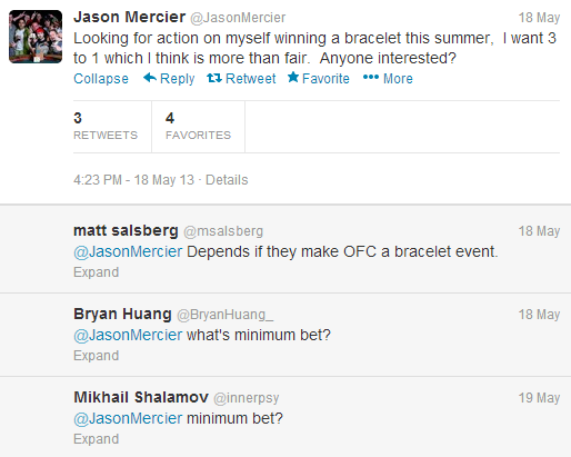 Помимо этого, за последние несколько дней еще одна тема с тэгом WSOP начала буквально распылять всевозможные форумы. Известный профессионал из команды PokerStars Pro – Джейсон Мерсье объявил акцию невиданный самоуверенности и, возможно, щедрости в твиттере. Его предложение просто как мир – он решил поставить дeньги на то, что выиграет браслет на предстоящем WSOP 2013 с коэффом 3 к 1.