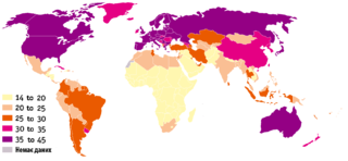 Средний возраст по странам. Преобладание молодежи наличествует в Африке и чуть в меньшей пропорции в Южной и Юго-Восточной Азии и Центральной Америке.
