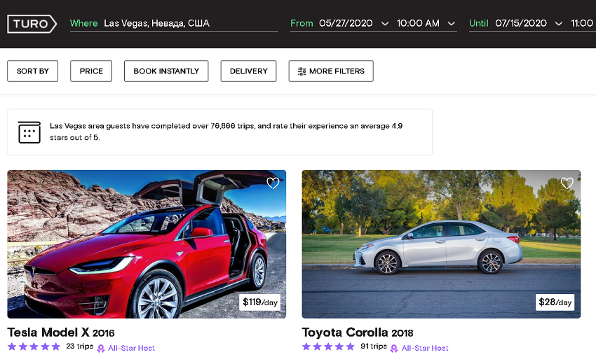 Ещё дешевле автомобиль можно арендовать на специальном сервисе Turo. Там собственники автомобилей предлагают в аренду свои авто. Преимущество сервиса в первую очередь ― это стоимость, во вторую ― возможность выбрать конкретный автомобиль. Потому что в фирмах ты выбираешь только класс авто.