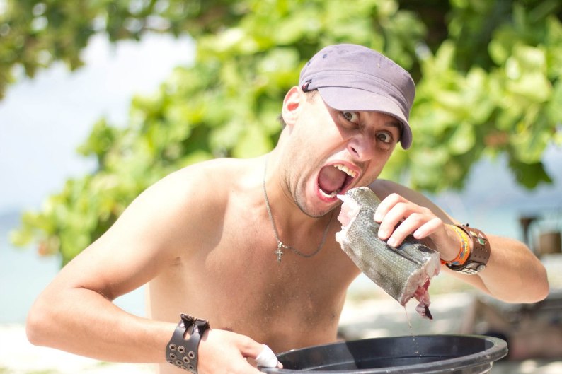 Сначала с куском попозировал Магвай, потом его попробовали сырым, ну и затем уже зажарили. Надо сказать достаточно вкусная рыба, тем более была очень свежей.