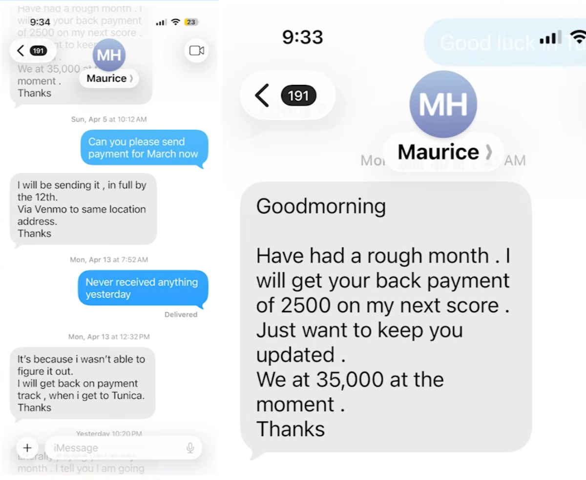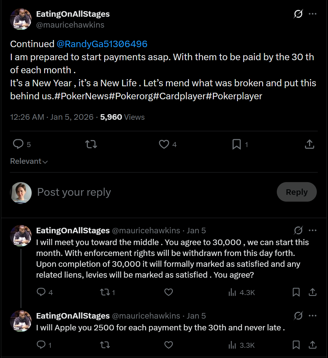 В качестве контр-аргумента журналисты вытащили его переписку с Рэнди сразу после выигрыша Морисом $17K в Тьюнике. Гарсиа просит его прислать оплату за март — а Хокинс сначала говорит, что отправит деньги до 12 апреля, а на следующий день после истечения срока и напоминания — что он не смог разобраться с ситуацией и отправит деньги уже со следующего заноса.