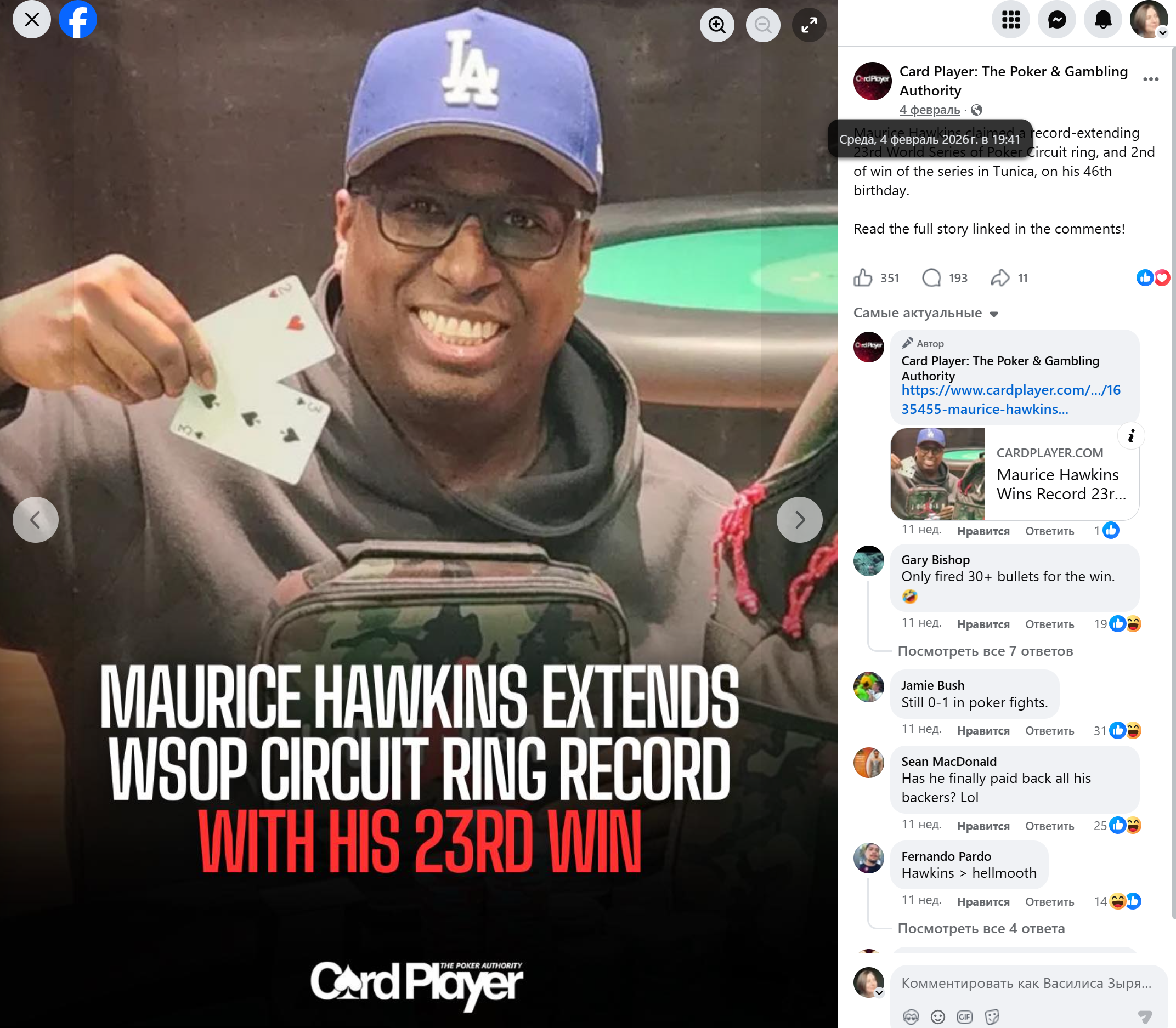 22 апреля обладатель рекордных 23 колец WSOP Circuit и известный должник Морис Хокинс не смог получить призовые после вылета из турнира из-за судебного решения, о котором он не знал. PokerNews поделился деталями этой истории на подкасте 26 апреля, а уже на следующий день Морис пришёл к ним в качестве гостя — и устроил настоящий мастер-класс по тому, как уклоняться от ответственности.