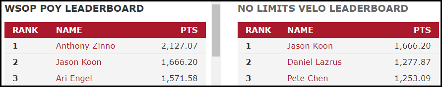 Если по итогам прошлой недели лидером обоих рейтингов — игрока года на WSOP (WSOP POY) и отдельного по событиям NLH в офлайне и онлайне — был Джейсон Кун (Jason Koon), то на этой неделе благодаря двум победам в смешанных играх Энтони Зинно вырвался вперёд по WSOP POY, причём с отрывом от Куна по очкам в два раза.