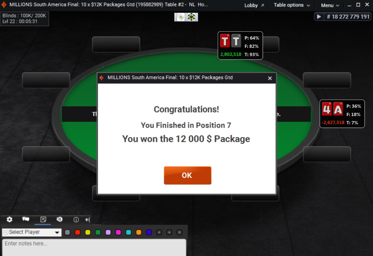 Если не смотреть на 12-ое место и скайлимитный бай-ин, вполне достойный и самодостаточный занос. Но, как мы все знаем, в МТТ любое место, кроме первого принимается как поражение. За топ-1 с нокаутами дали бы $200k+, но в какой-то момент раздали стрит в стрит на постфлопе, и, думаю, от такой пули не увернулся бы даже Хельмут в свои лучшие годы.