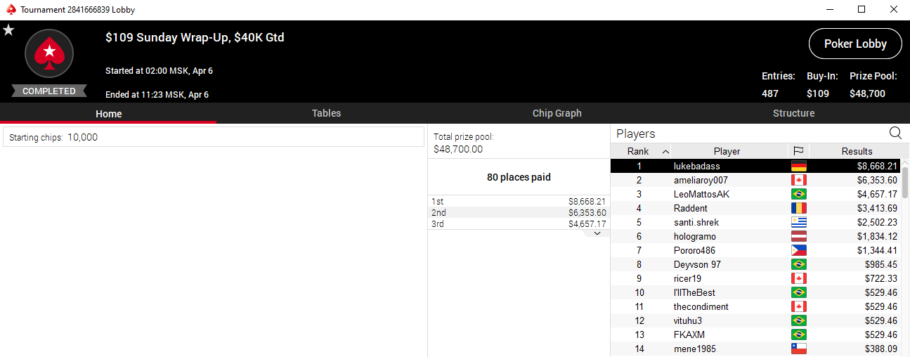 P.S.: канадец ameliroy007 не был забанен на PokerStars. Это подтверждается фактом, что в прошлое воскресенье он занял 2 место в турнире Sunday Wrap-Up за $109 и получил приз $6,353. Назовём это хэппи-эндом.