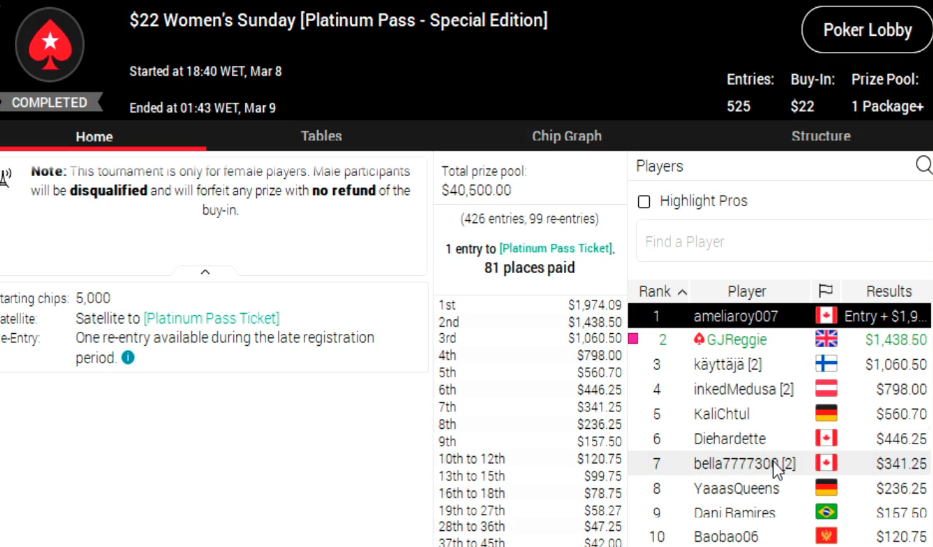 Победителем турнира Women's Sunday стала дама из Канады под ником ameliaroy007. За первое она получила $1974 + Platinum Pass. Из недавнего ролика PokerStars о способах борьбы с ботами и нечестными игроками, мы узнали, что покер-рум уделяет отдельное внимание победителям крупных турниров, прежде чем выплатить выигрыш. И абсолютно не зря, ведь ameliaroy007 оказалась мужчиной. Детали расследования история умалчивает, поэтому примем эту информацию как факт.