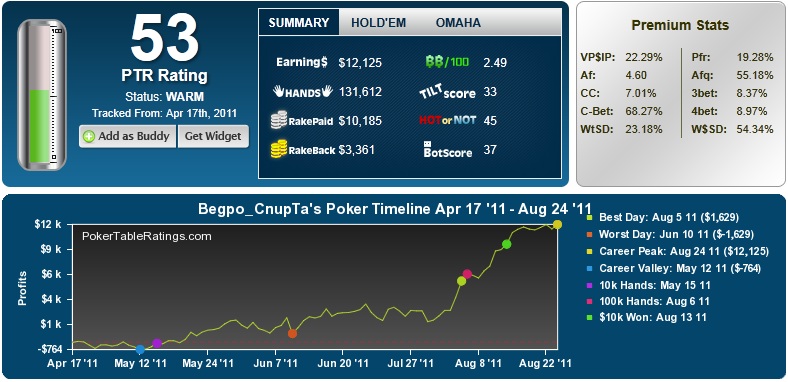 - 2010 год закончился для меня великолепно, за октябрь-декабрь я занёс порядка 25к. И уверенно выдвинулся на нл400-нл600 старзов. Но успехов я там не добился, даунстрик сменил тильт, а затем я вовсе поломал игру и начал заливать чудовищными для моего банкрола темпами. Вспоминая те времена я понимаю, какие чудовищные ошибки я допускал, я тильтовал, увеличивал количество столов, играл не по банкролу. Меня спасла *чёрная пятница*. Я вывел остатки банкрола и взял перерыв в несколько дней. Ссылка на ПТР старзы