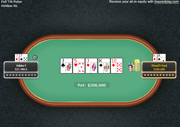 Алекс «IReadYrSoul» Миллар играл хедз-ап со знаменитым Виктором «Isildur1» Блумом на тех же самых лимитах. Парочка просидела около трёх часов, Алекс непрерывно доминировал, но Исильдуру иногда даже удавалось делать небольшие камбеки. В конце концов профессионал с Full Tilt Poker всё-таки встал из-за стола в минусе. Одним из самых больших разыгранных банков ($208,600) стал следующий: