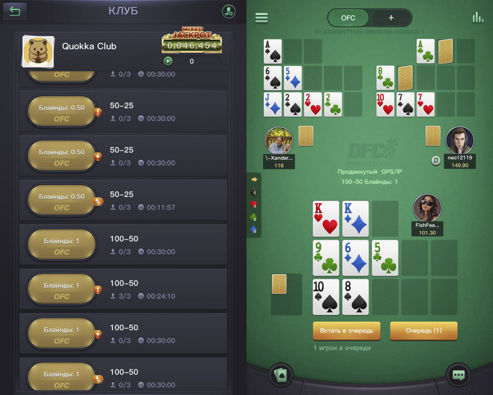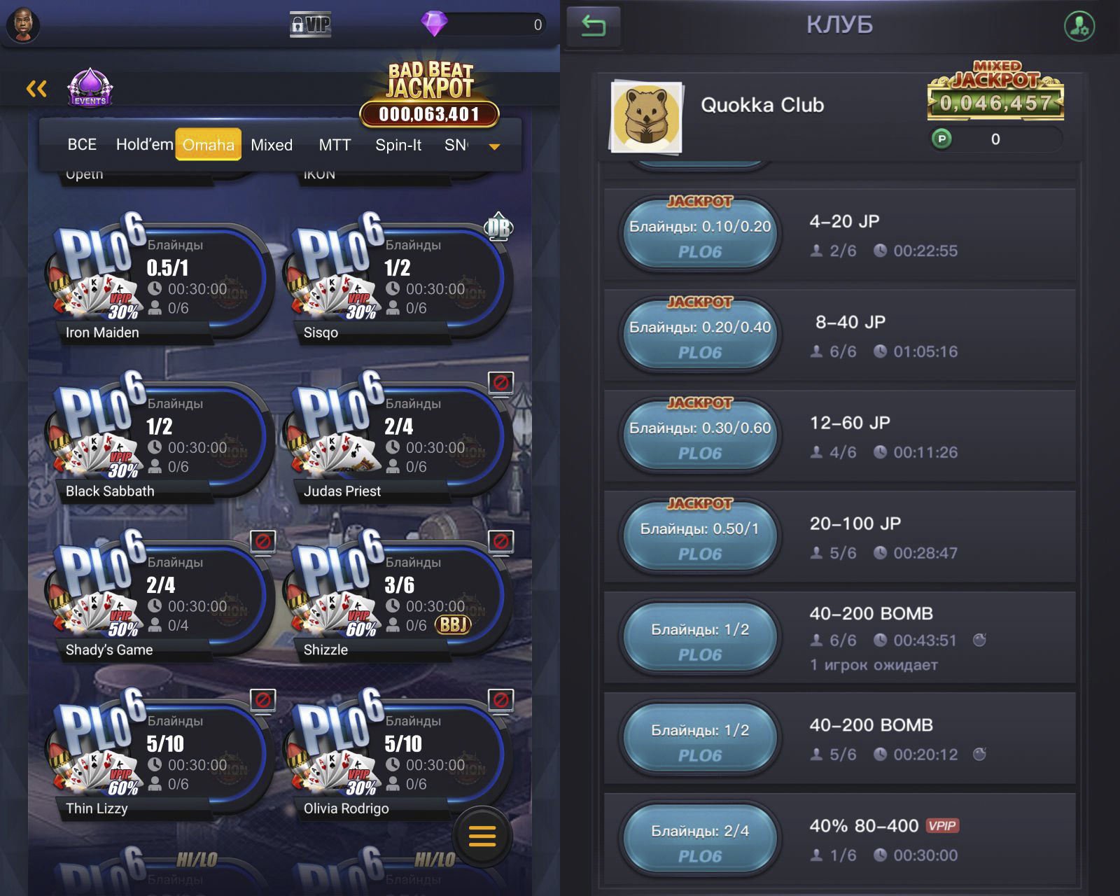 На PPPoker лимиты кеша также сильно разнятся между клубами. Например, в Quokka Club на 15:00 МСК 20 марта PLO6 был доступен с лимитами от 0.10/0.20 до 2/4, в том числе с джекпотом и бомб-потами, а PLO6 Hi/Lo — только с лимитом 0.20/0.40.