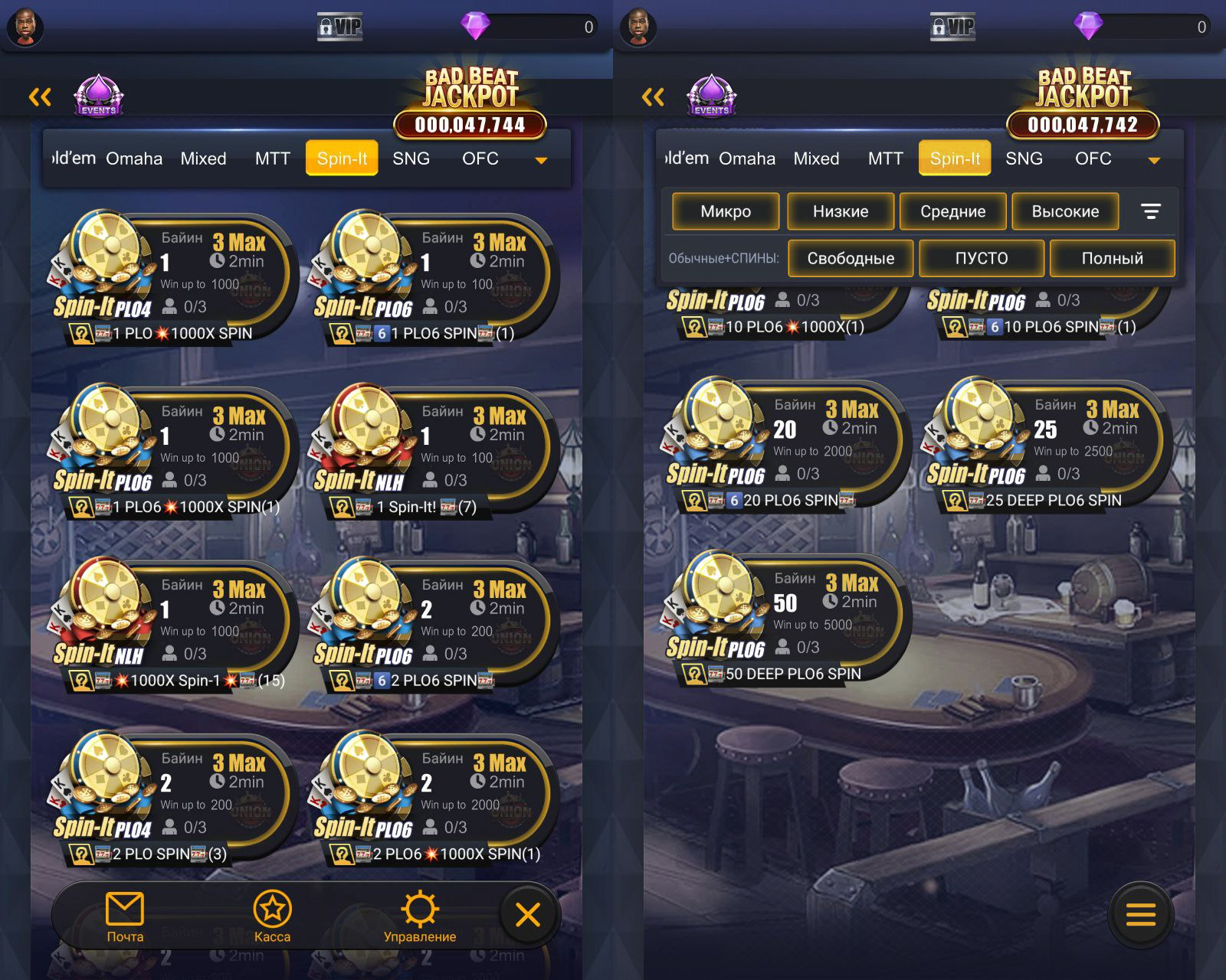 В некоторых клубах можно найти не только кеш, но и турниры по PLO6, хотя чаще всего их запускают в рамках какой-нибудь серии или в честь праздников. При этом на PokerBROS можно встретить даже регулярные Spin-It по этой дисциплине. Они играются по классическим правилам Spin&Go — в 3-максе со случайно определяемым размером призового фонда. Бай-ины там стартуют от 1 и доходят до 50.