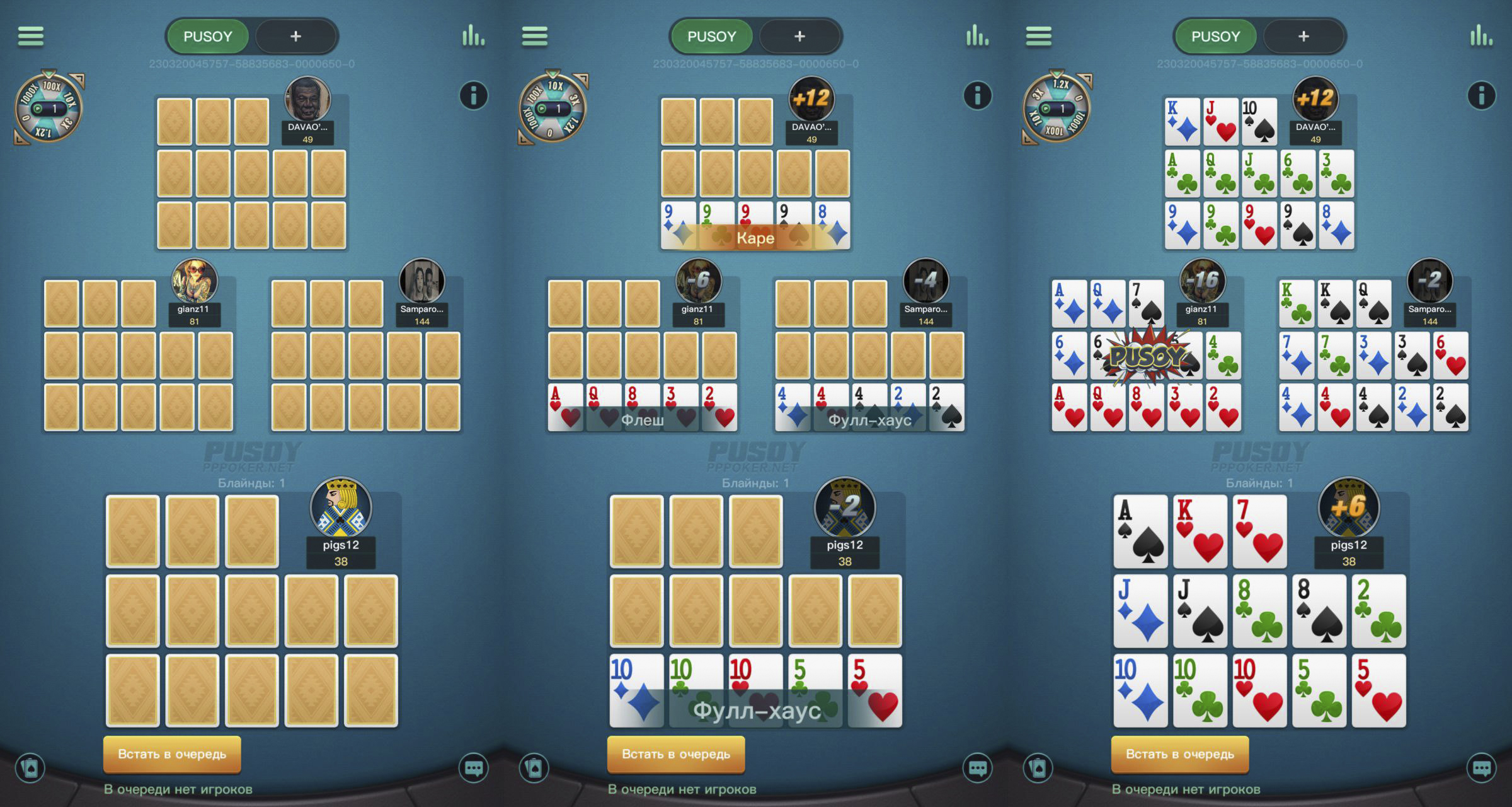 На PPPoker есть также вариация Ананаса под названием Pusoy — правила в ней фактически такие же, только нет никаких раундов: каждому игроку в начале раздачи сразу выдают по 13 карт, которые нужно разложить на трёх линиях.