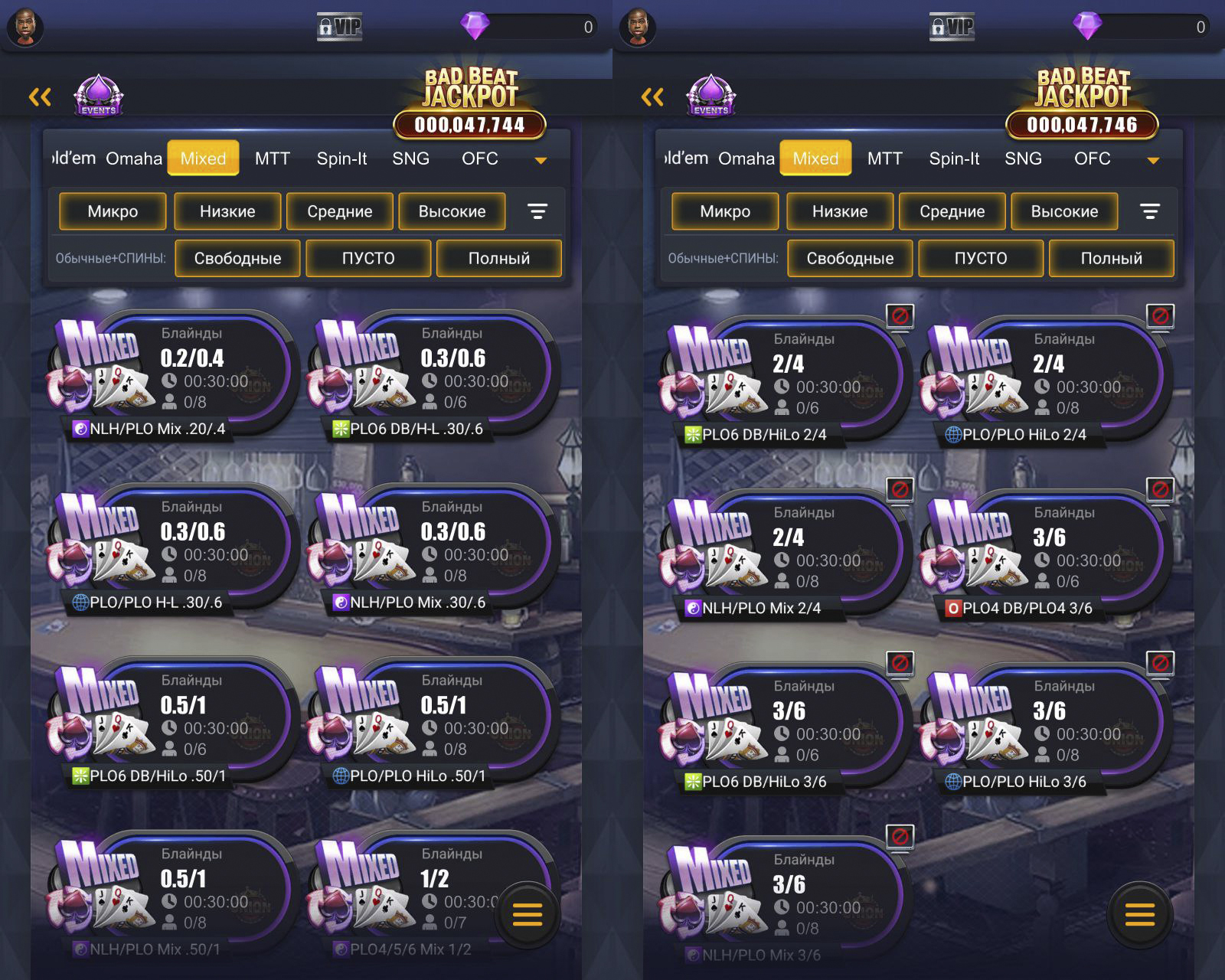 - NLH + PLO лимитов 0.20/0.40, 0.30/0.60 и 0.50/1.
