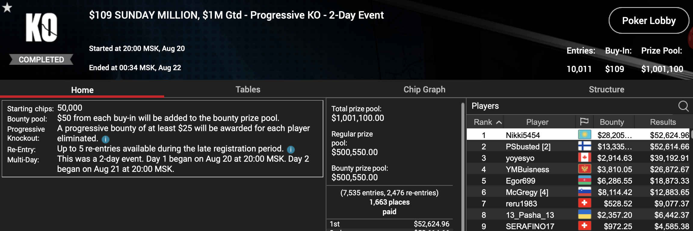 В этот раз за финальным столом $109 Sunday Million не было ни одного бразильца. Зато вышли сразу несколько наших игроков.