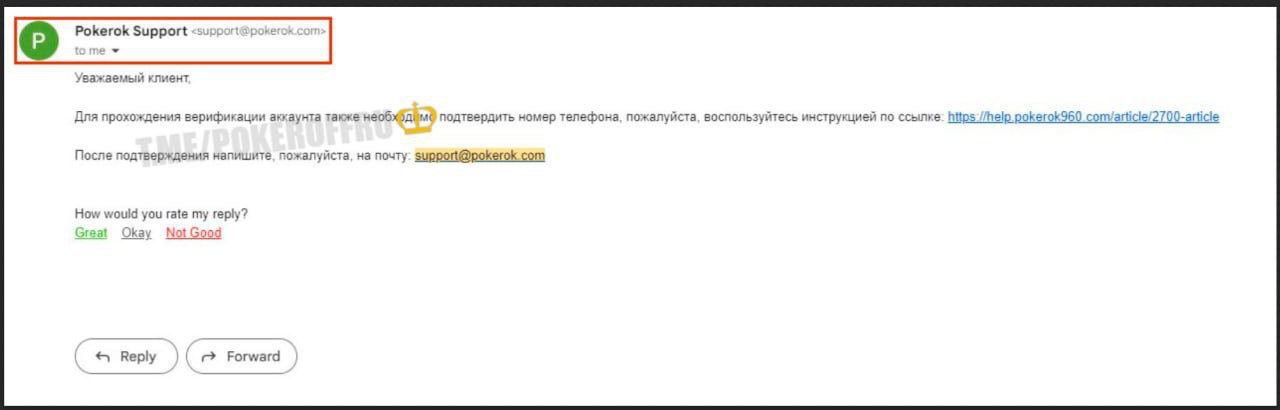 В последние пару недель игроки стали чаще получать поддельные письма, которые полностью повторяют структуру и оформление писем службы поддержки ПокерОК.