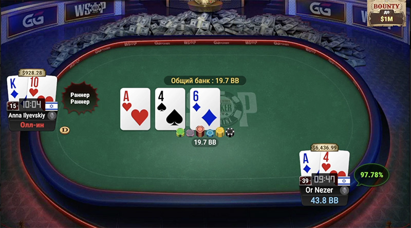 В 5-max Ор Незер вышел со стеком 115 бб, в сумме у четверых оппонентов было 43 бб. С этого момента Ор перешёл практически полностью на игру олл-инами.