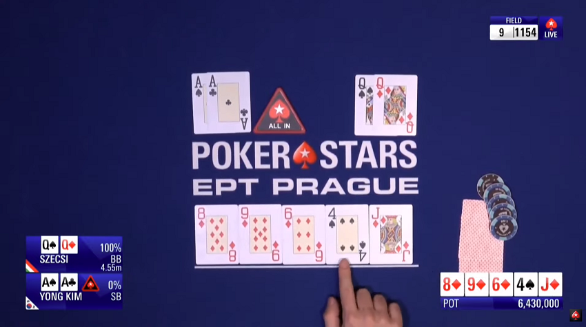 А на 9-м месте заканчивает своё выступление в турнире игрок из Южной Кореи Gab Yong Kim в очень обидной раздаче. Его тузов переехали дамы Norbert Szecsi, собрав флеш на ривере. В начале раздачи кореец имел стек 79бб.