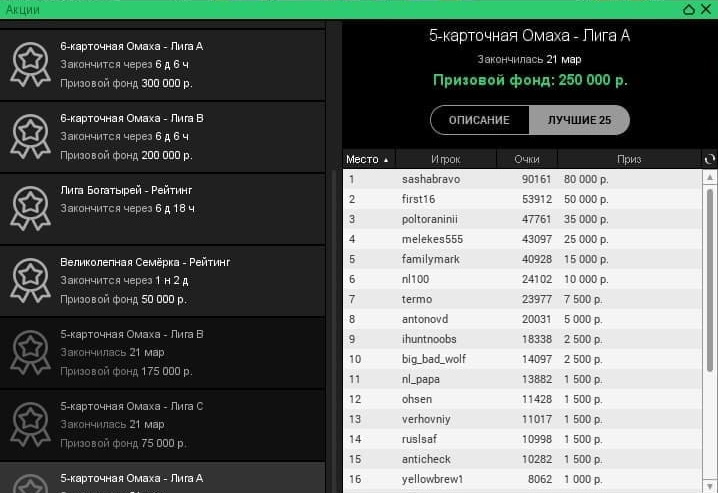 - Лига В — призовой фонд ₽500,000, лимиты от ₽10/20 до ₽25/50 включительно