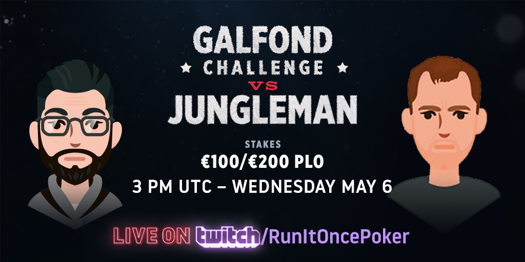 Сегодня, 6 мая, в 18:00 МСК пройдёт мини-челлендж Фила Гальфонда против Дэниела «jungleman» Кейтса (Daniel Cates). Звёздная пара сыграет 750 раздач PLO €100/200 без сайдбета на Twitch-канале RunItOncePoker. Здесь битва будет вестись скорее не за деньги, а за респект: проигравший должен будет записать видео, где объяснит, почему победивший является «лучшим человеком и сильнейшим игроком».