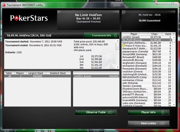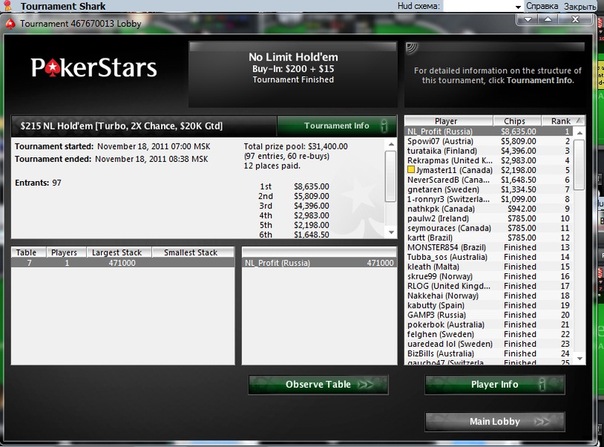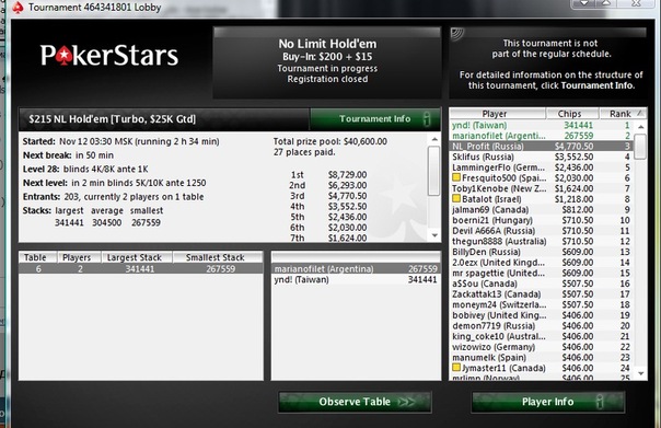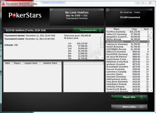 Очень неплохо складывалось в турбинах по 215 (5 финальных столов). Также были финальные столы в ребайнике по 3++, 8++, 50++ биг анте и 50 гипер турбо, 33 2р1э. Также выходил на финальный стол 100++ с ребаями (8 место к сожалению).