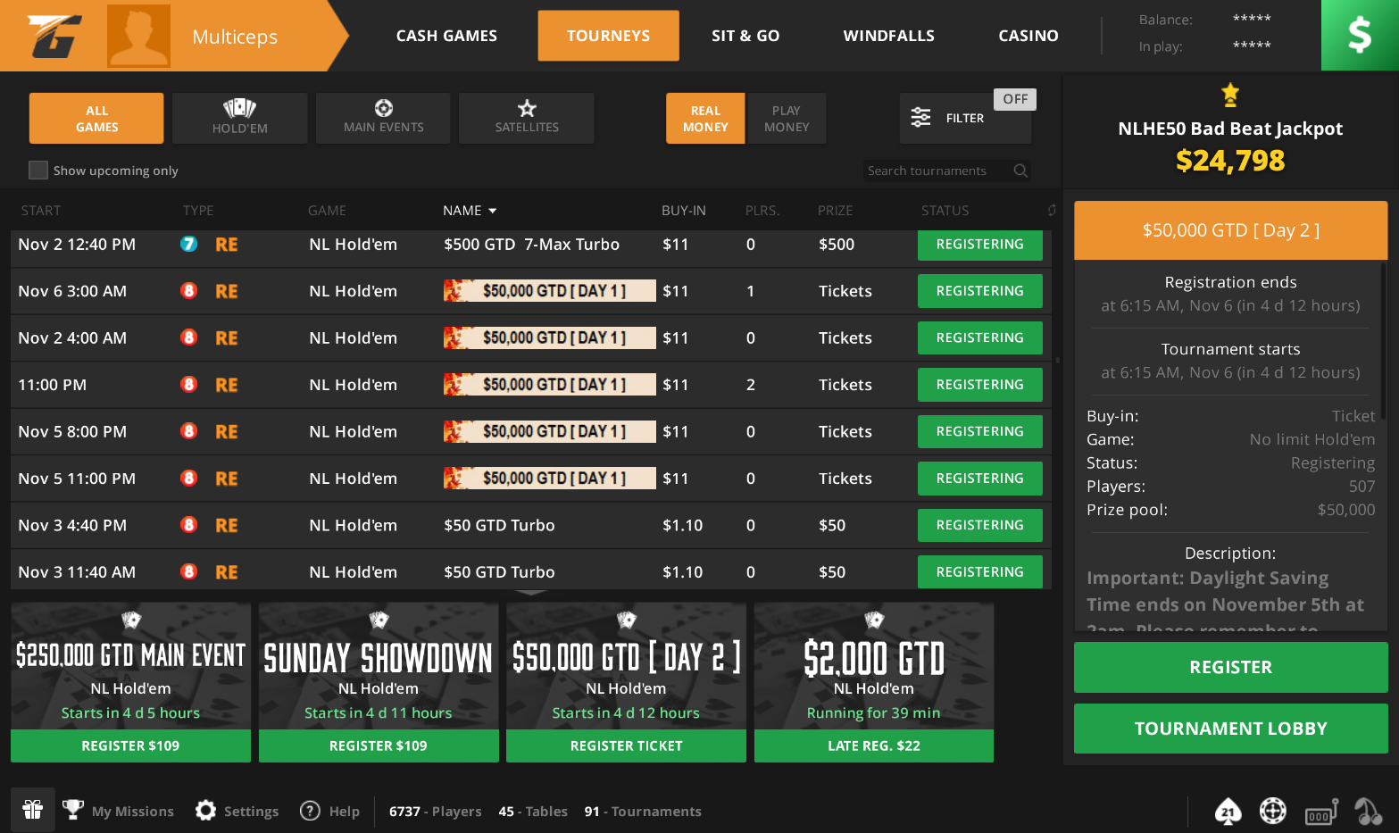 Каждый день по одному расписанию стартуют турниры за $55 с различными гарантиями: