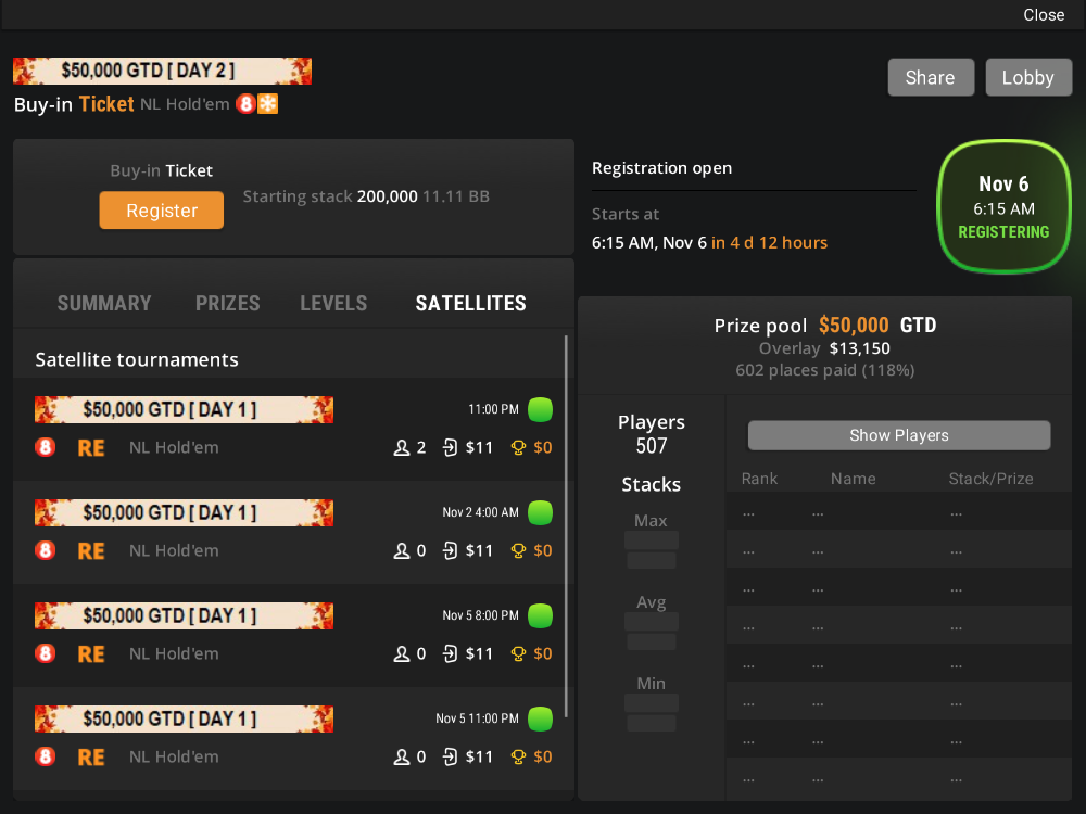 Для этого мультифлайта доступна акция — сыграв в период проведения флайтов 1 руку в кеше или 1 турнир с 13:00 до 04:00 МСК, каждый игрок может получить билет в сателлит за $0.50.