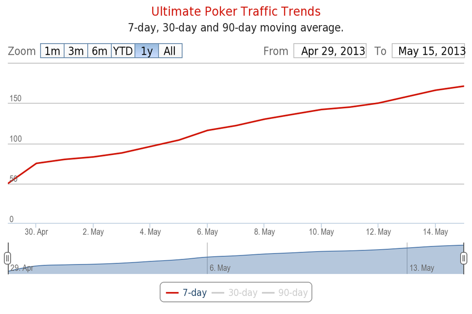 Здравствуйте, дорогие читатели, мы продолжаем нашу рубрику новостей онлайн трафика игровых сетей (прошлый пост тут). Эта неделя была довольно продуктивной, хоть и не для всех румов, в чём можно убедиться посмотрев пару графиков с восходящими и нисходящими. Вкратце говоря, UltimatePoker испытывает подъем трафика на 20% с момента старта, 888 Poker обгоняет международный рынок на 65% в отрезке 2-х лет, а Full Tilt Poker восстановил свою вторую позицию в гонке. Ну что ж, приступим.