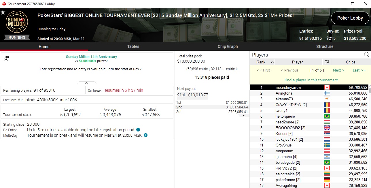 Турнир растянулся на три игровых дня, и на момент публикации материала в игре числится 91 участник. Чиплидер — неизвестный канадец под ником meandmyarrow, но мы будем следить за успехами этих парней, в чьих стеках сейчас теплятся десятки, а может и сотни тысяч долларов: