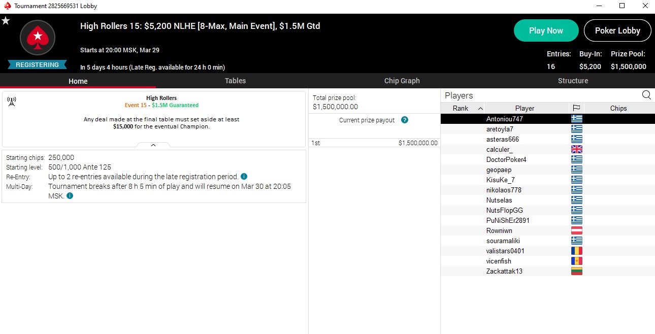 Мэйн Эвент с бай-ином $5200 запланирован на 29 марта. Сателлиты на него уже можно найти в лобби. Хайроллерскому Мейну подобают хайроллерские сателлиты — их бай-ины составляют $215 и $530.